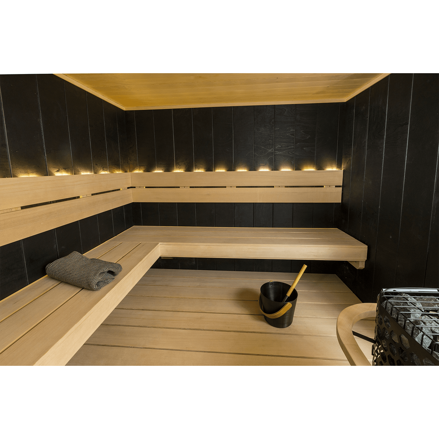 The luxurious sauna features black Taika interior paneling that contrasts beautifully with light-colored wood benches and integrated lighting, creating a serene environment. A rock-tower heater and the advanced SaunaLogic2 Wi-Fi Control ensure optimal warmth and convenience. The result is a perfect blend of sophistication and ultimate relaxation.