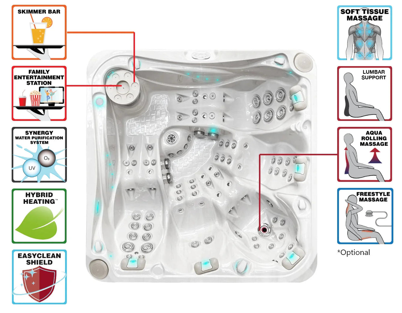 If you are looking for a spa for your family with the same viewing direction, the 2020 addition to the Signature Collection: The Devotion Spa is the right choice for you. With three full body loungers and two semi-loungers it is a unique new spa that offering loungers for five people. The Devotion comes standard with proprietary features such as Easyclean Shield, Dual-Source Heating™ and Aqua Rolling Massage™, as well as the newly designed Neck Relief Massage™ system. The Neck Relief Massage™ is a new therapy specially created by Passion Spas which focuses on loosening your neck muscles by massaging from top to bottom your neck muscles. The Devotion also features our exclusive Synergy Water System, automatically maintaining clean and fresh water, making this new spa both a relaxing and an energy efficient choice.