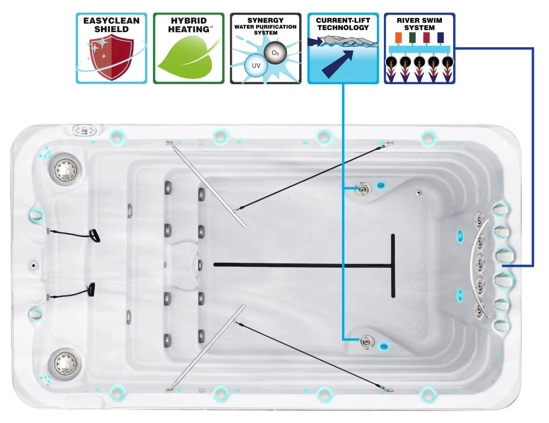 The Fitness 1 Swim Spa is designed to provide an authentic swimming experience that adjusts to the intensity of your workout. The innovative Current-Lift technology automatically adjusts the water current to the intensity of your workout. As you decrease the force of the upper two swim jets, the lower swim jets automatically increase in intensity, creating more “lift,” providing more buoyancy as your swimming speed decreases. The faster you swim, the less lift is needed from the lower jets and the flow is directed to the upper jets for a stronger current. Swim Spas in the Fitness Collection also include Rowing Gear, Access Step and Synergy Water Maintenance System as standard features.