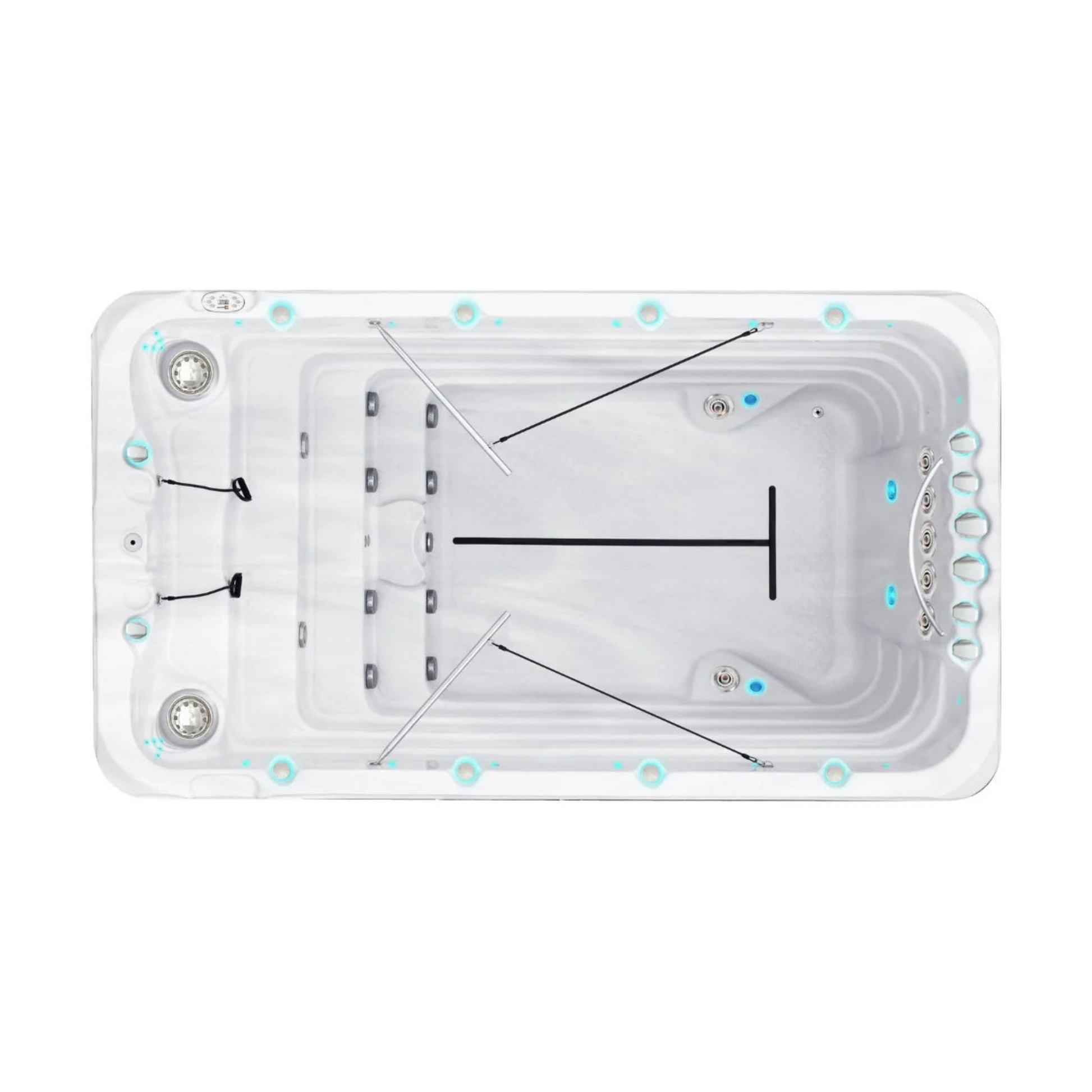 The Fitness 1 Swim Spa is designed to provide an authentic swimming experience that adjusts to the intensity of your workout. The innovative Current-Lift technology automatically adjusts the water current to the intensity of your workout. As you decrease the force of the upper two swim jets, the lower swim jets automatically increase in intensity, creating more “lift,” providing more buoyancy as your swimming speed decreases. The faster you swim, the less lift is needed from the lower jets and the flow is directed to the upper jets for a stronger current. Swim Spas in the Fitness Collection also include Rowing Gear, Access Step and Synergy Water Maintenance System as standard features.