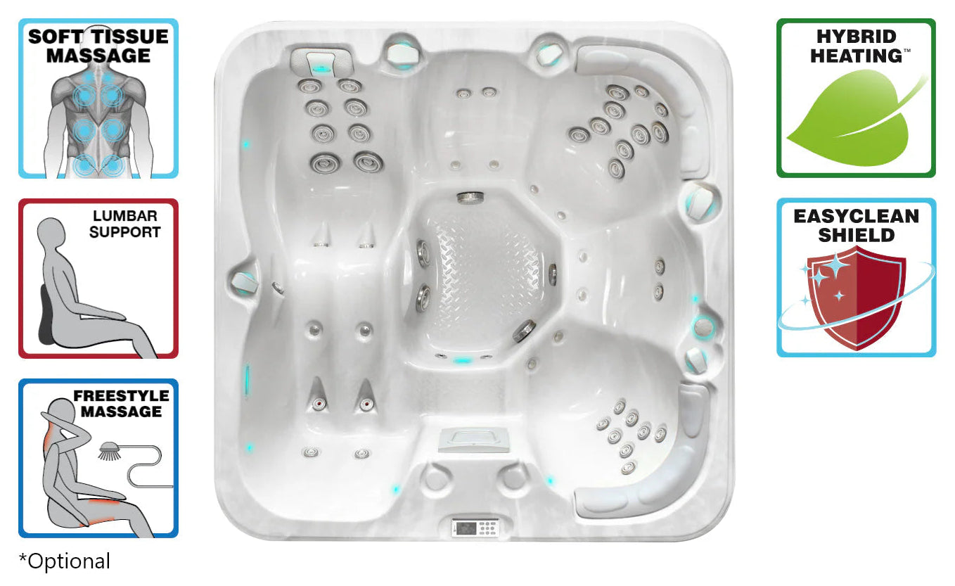 One of our most popular spas, the Refresh is a spacious 5-person spa combining bench, bucket and lounge seating. Seat configuration and jet placements were designed with recommendations from a physical therapist, providing maximum therapeutic benefit and comfort. The soft pillows, accent LED lighting, and flowing contours contribute in making all Passion Spa designs unmatched in beauty, performance and enjoyment.
